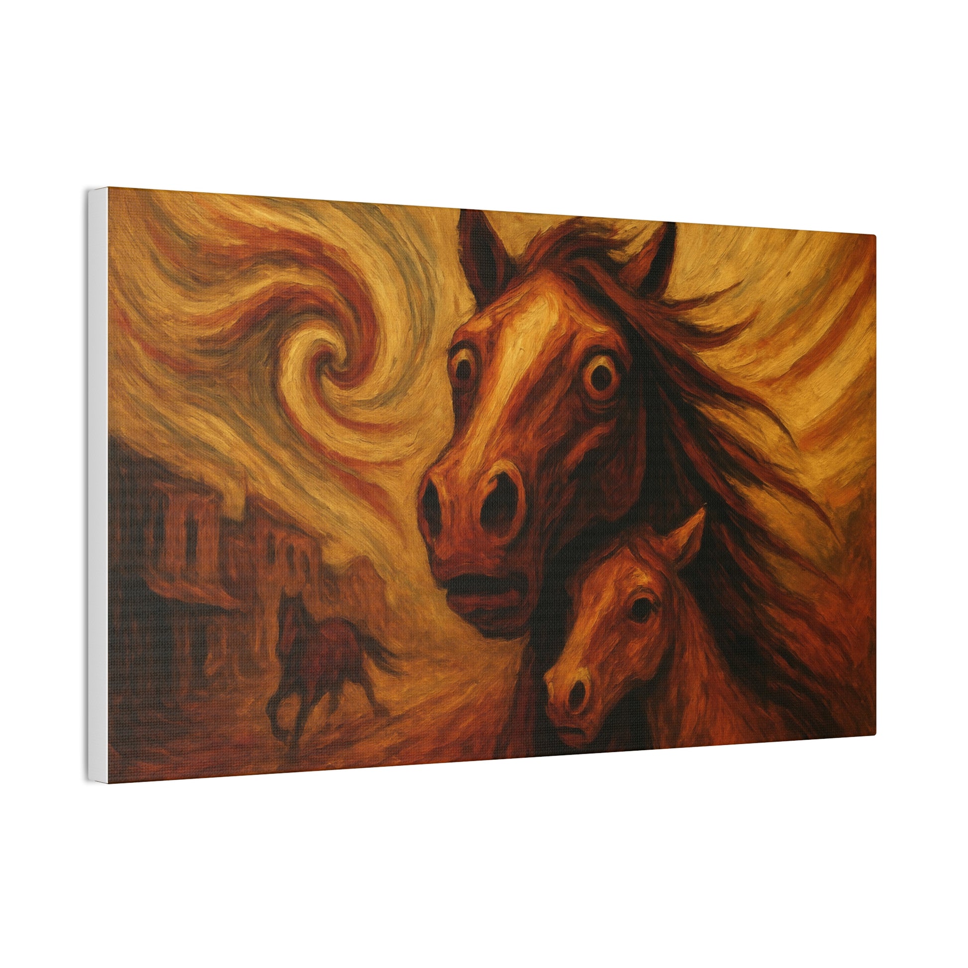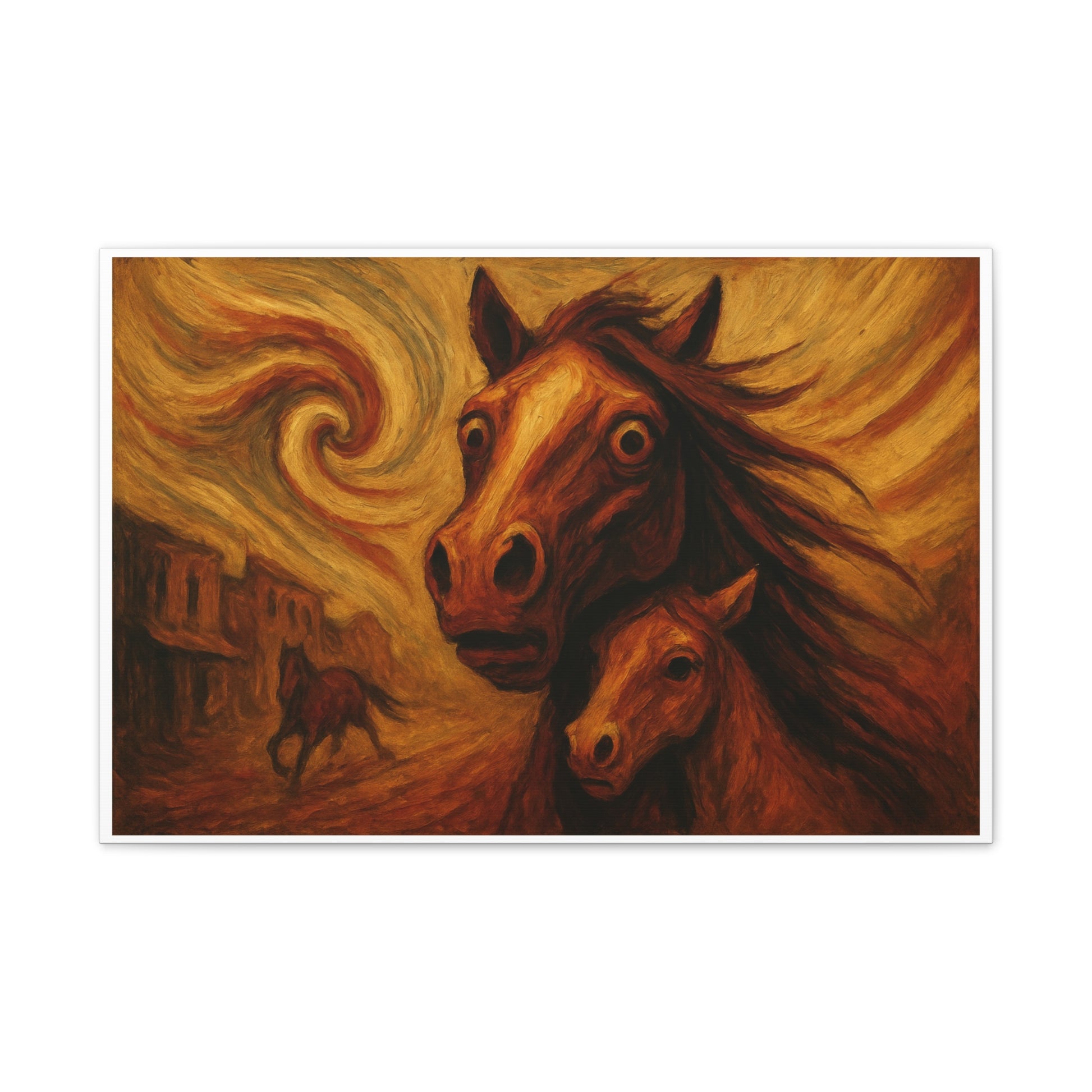 Painted with bold, fiery strokes, this piece centers on a wide-eyed mare and her foal as the sky churns behind them. Warm desert tones blend with expressive textures to create a sense of motion, emotion, and raw Western energy. Whether you see mystery, protection, or a wild story unfolding, it instantly becomes a conversation piece.