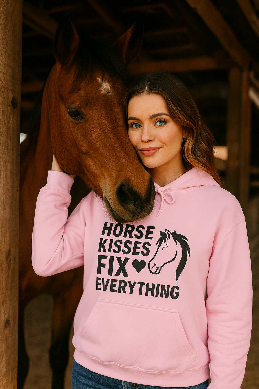 When the world feels heavy, horse kisses make it better—and so does this hoodie. The Horse Kisses Fix Everything Hoodie pairs bold, heartfelt lettering with a sweet horse graphic to show off the best kind of therapy. Cozy, durable, and made for equestrians, it’s perfect for chilly barn mornings, evening rides, or just lounging with your favorite four-legged friend.